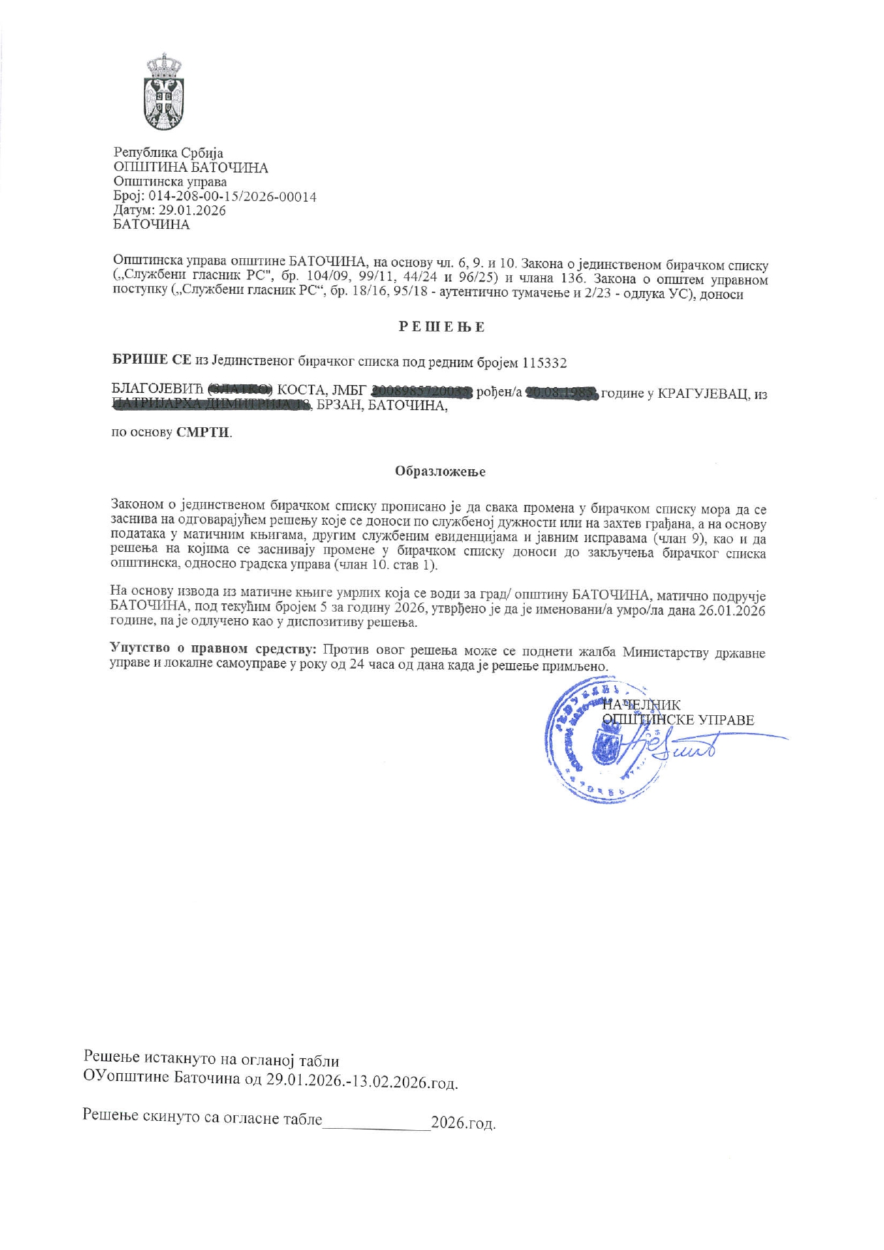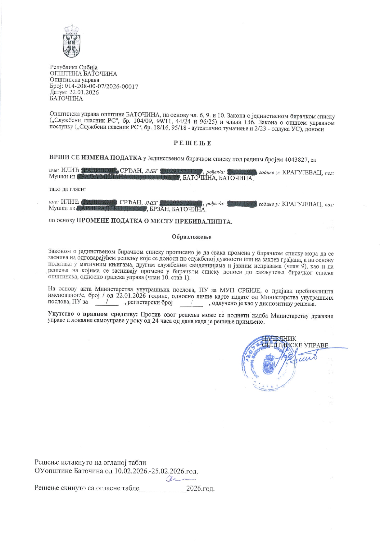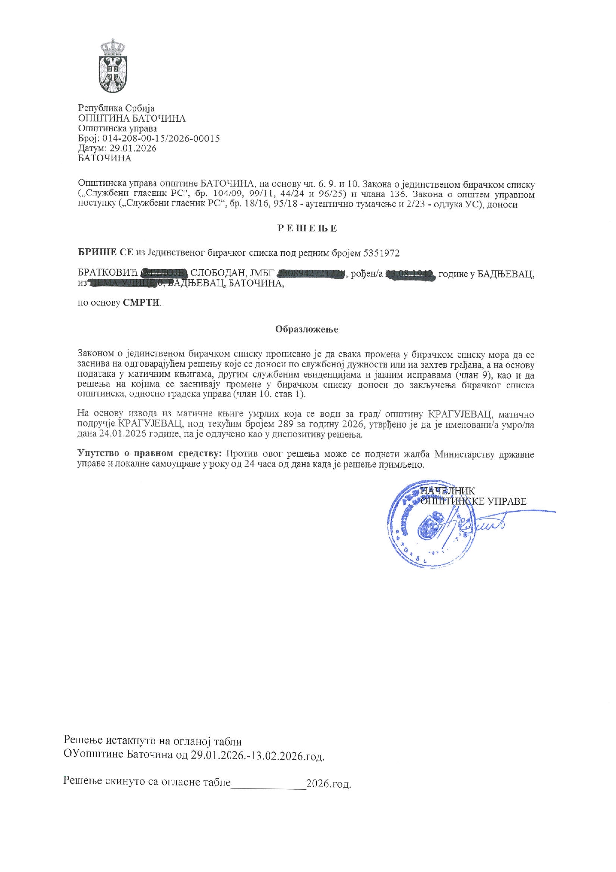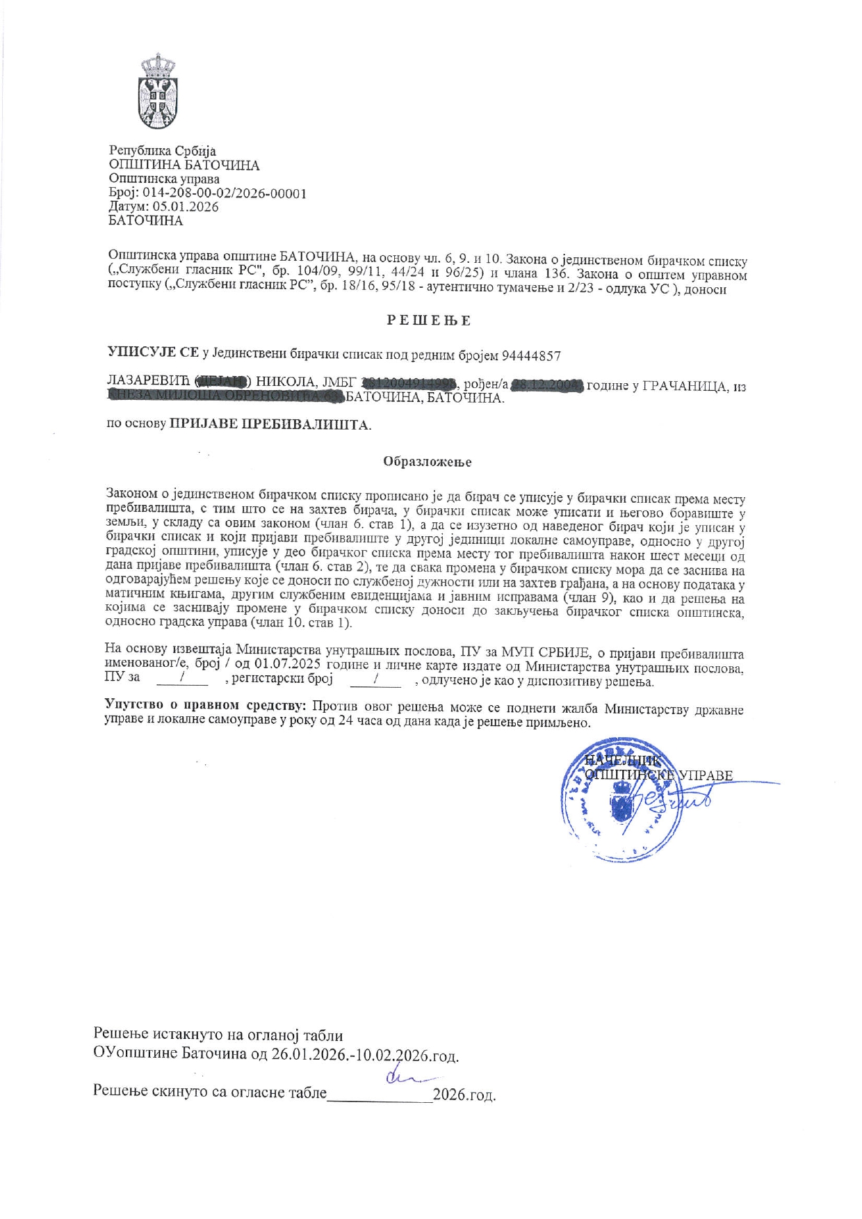- Илија Јовановић, Баточина, 26.01.2026.год.