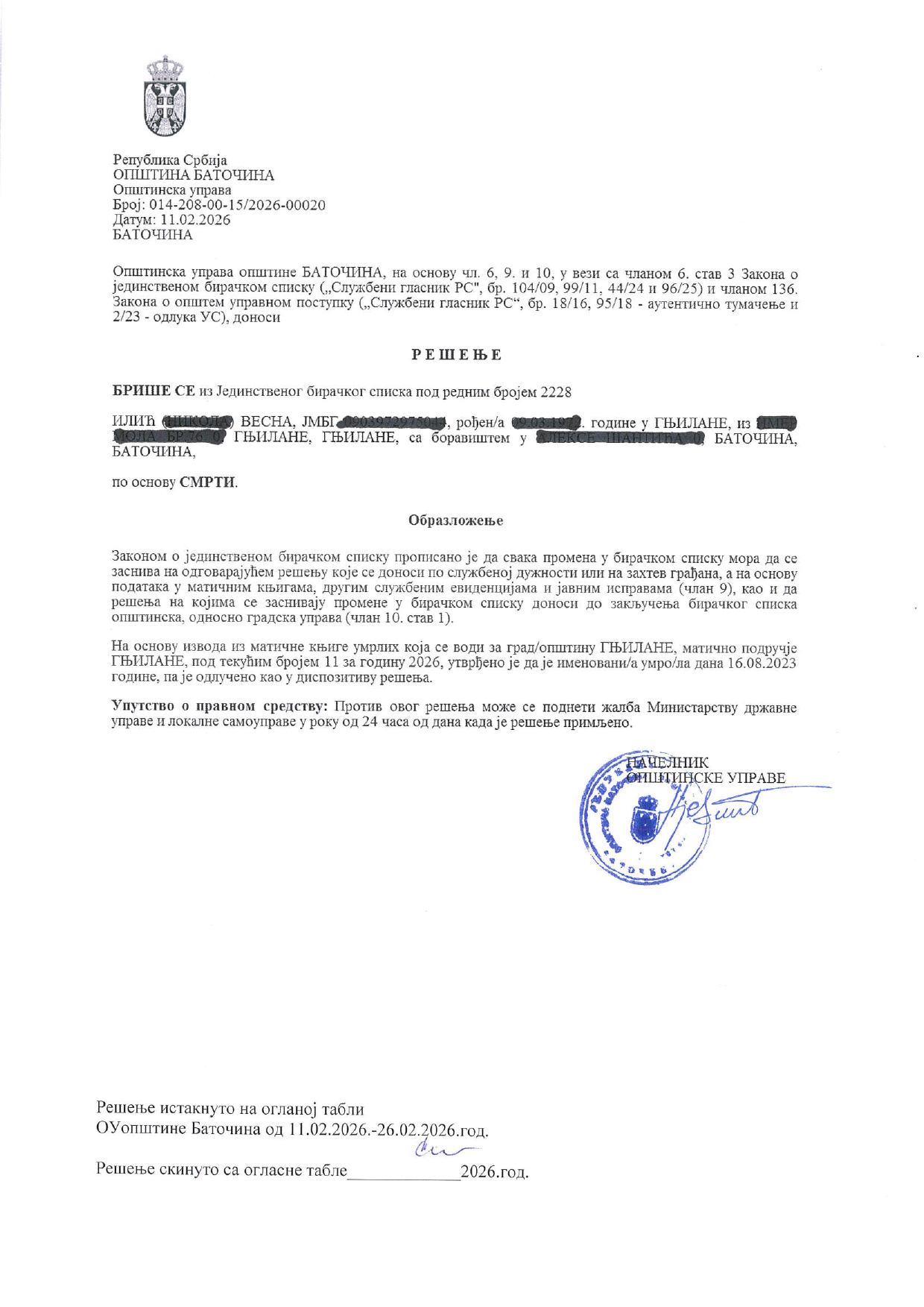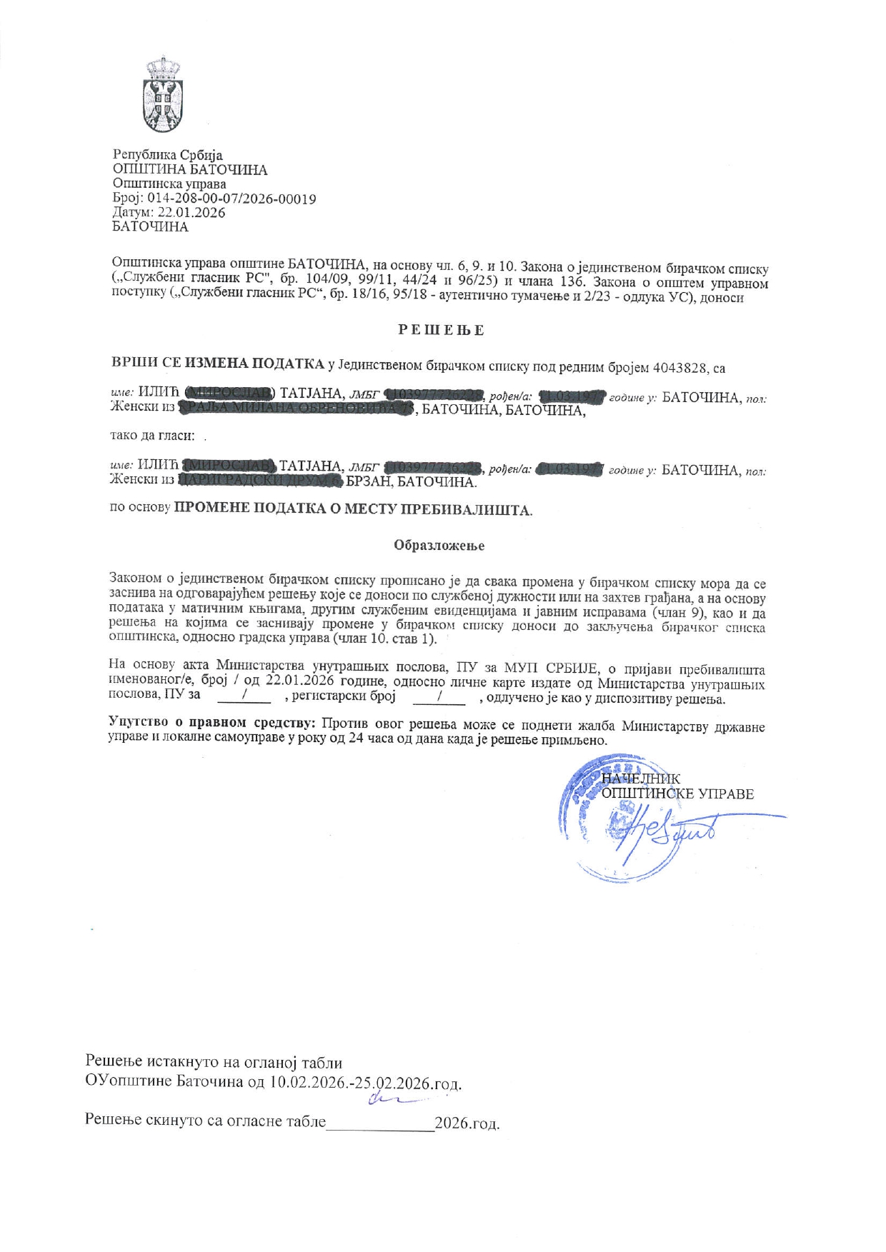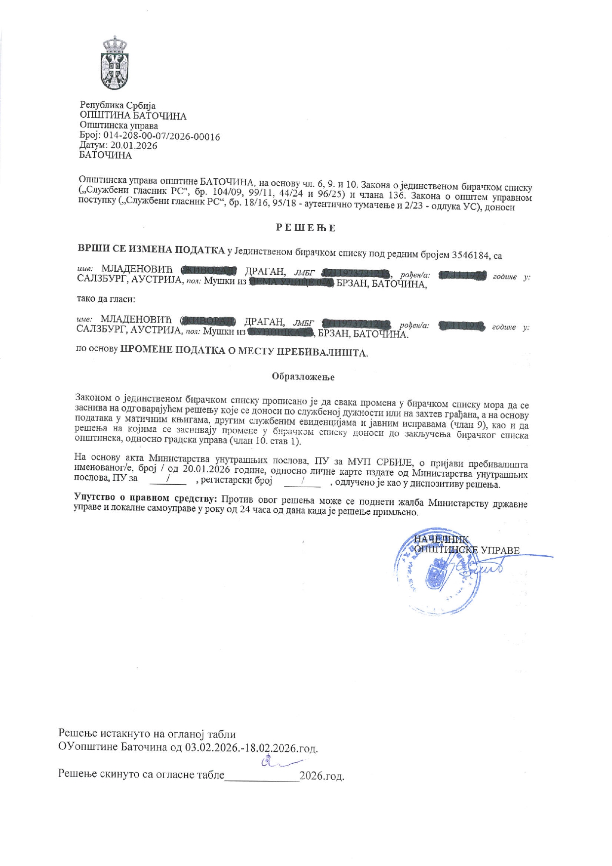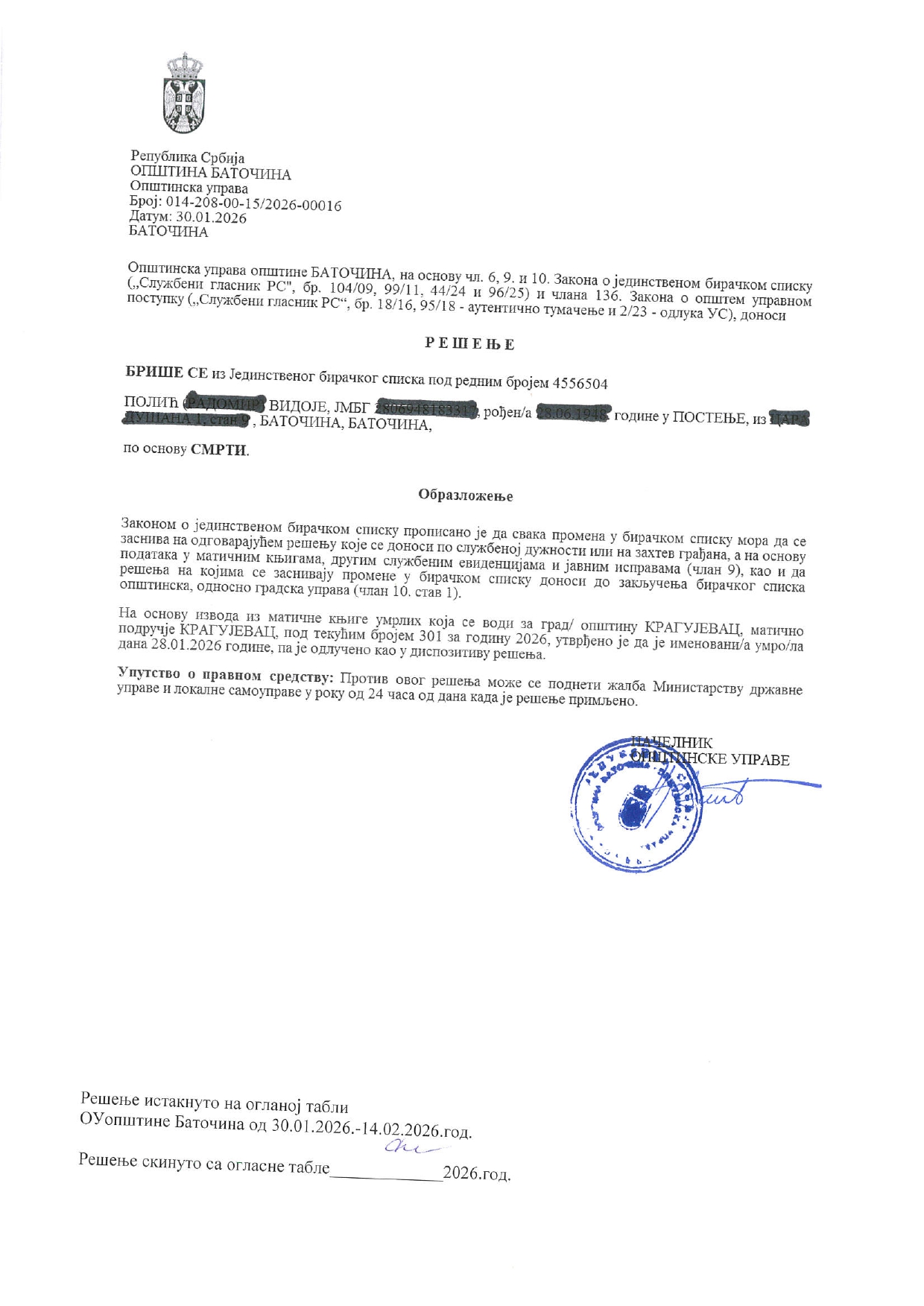 - Илија Јовановић, Баточина, 26.01.2026.год.